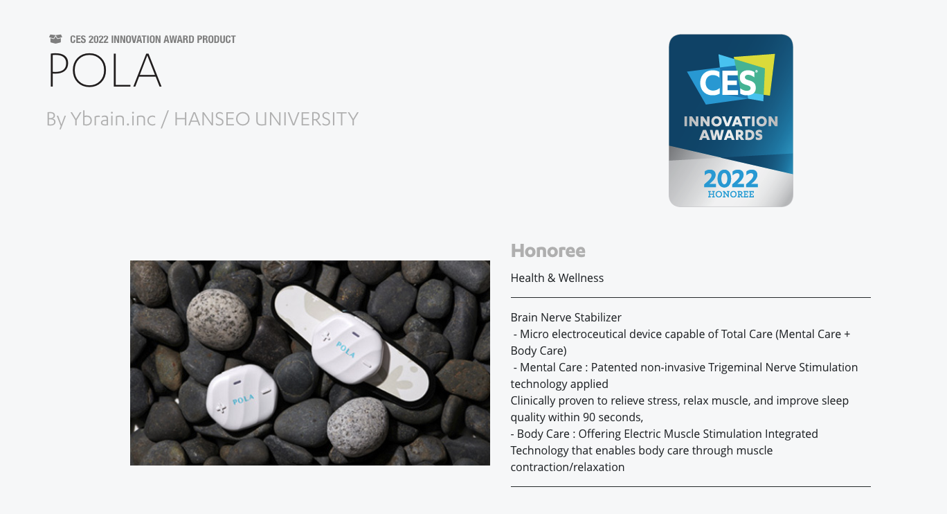 와이브레인의 폴라(POLA)가 세계 최대 IT 박람회 CES 2022의 '건강 및 웰빙' 부문에서 혁신상을 수상하였습니다. 폴라는 멘탈 케어와 바디 케어 모두 가능한 디바이스입니다. 스트레스로부터 벗어나기 위해 태어난 '두뇌신경 안정기기' 폴라는 뇌과학을 연구하는 와이브레인에서 개발하여 YPD 파형이 장착되어 있습니다. 또 탐색임상을 통해 그 성능이 증명된 제품입니다.