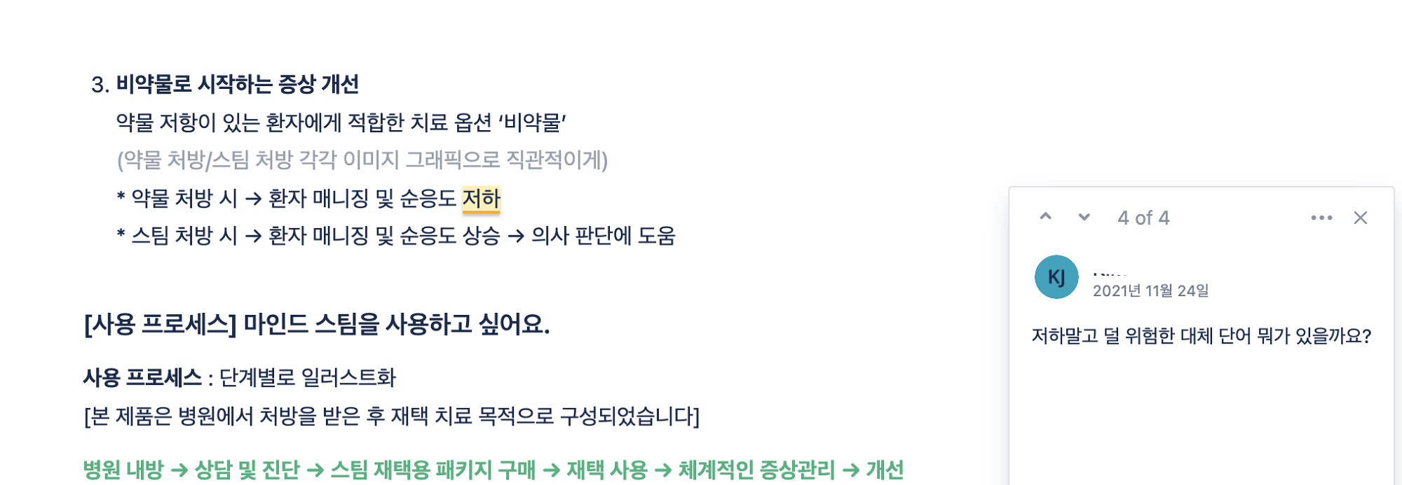 '마인드 스팀(MINDD STIM)'의 상세페이지 시안을 기획하여 담당 디자이너에게 업무 요청안을 작성한 화면입니다. '저하'라는 부분에 대한 의견을 댓글기능을 활용해서 추가한 화면임이 보이죠.ㅎㅎ 이런 식으로 커뮤니케이션하며 업무를 처리하는데 편리한 툴이라고 볼 수 있습니다. 협업 뿐만 아니더라도 개인 스스로가 문서를 정리하고자 한다면 적극 활용할 수 있을만한 툴이라고 생각합니다.