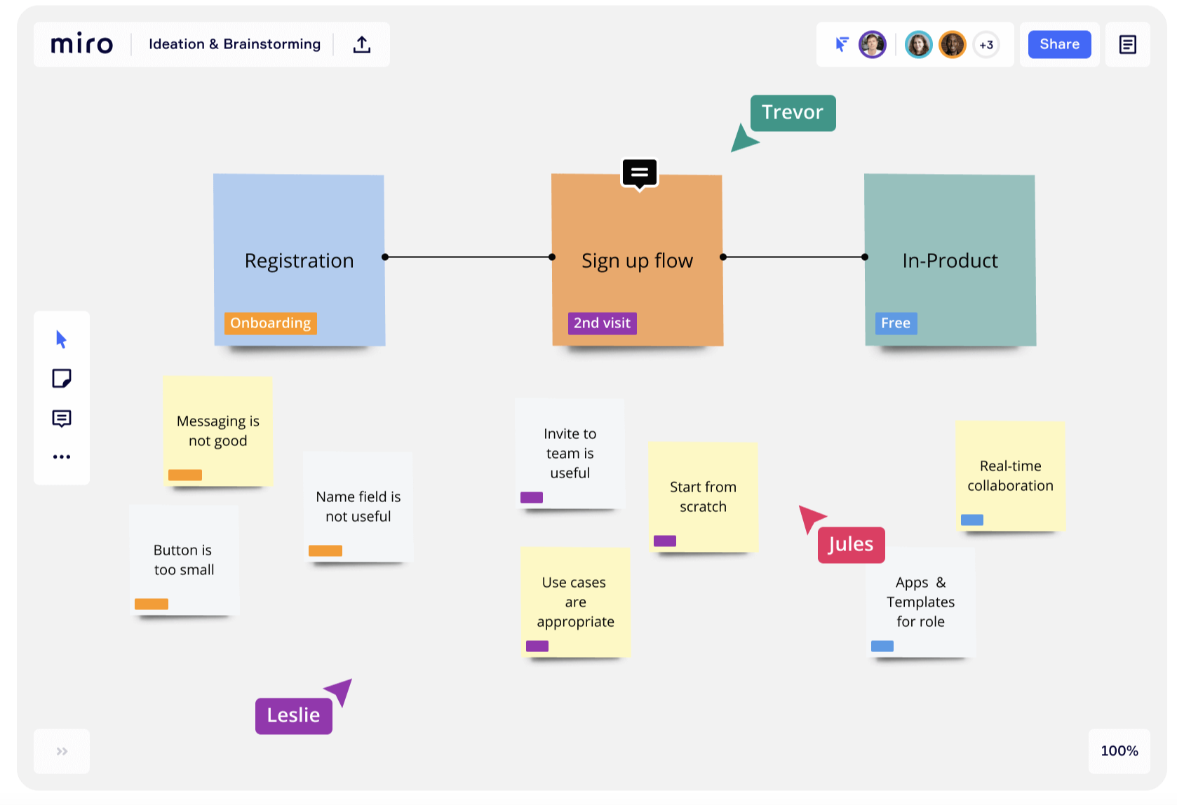 미로는 아이데이션, 브레인스토밍에 빠질 수 없는 툴입니다. 저도 여러가지 업무 도구들을 보면서 세상 살기 좋아졌구나라고 생각한 적이 있는데 미로는 특히나 더 놀랬습니다. 아예 도화지, 그러니까 그림판처럼 아무것도 없는 공간에 우리 맘대로 작성하고 그릴 수 있기 때문입니다. 이 자유로움은 아이데이션이나 브레인스토밍, 매핑에 유리합니다. 기획을 할 때 우리는 이것저것 레퍼런스를 찾고 또 찾다가 '그때 그게 뭐였지?'하고 까먹을 때가 있죠.. 미로를 활용하면 레퍼런스를 서치할때도 유용하게 정리할 수 있습니다. 마음대로 그룹핑하고, 섹션을 나누고, 포스트잇을 붙일 수 있어요. (아이패드로 미로를 사용해본적은 없지만 아이패드와 아주 환상의 궁합일 듯 합니다)