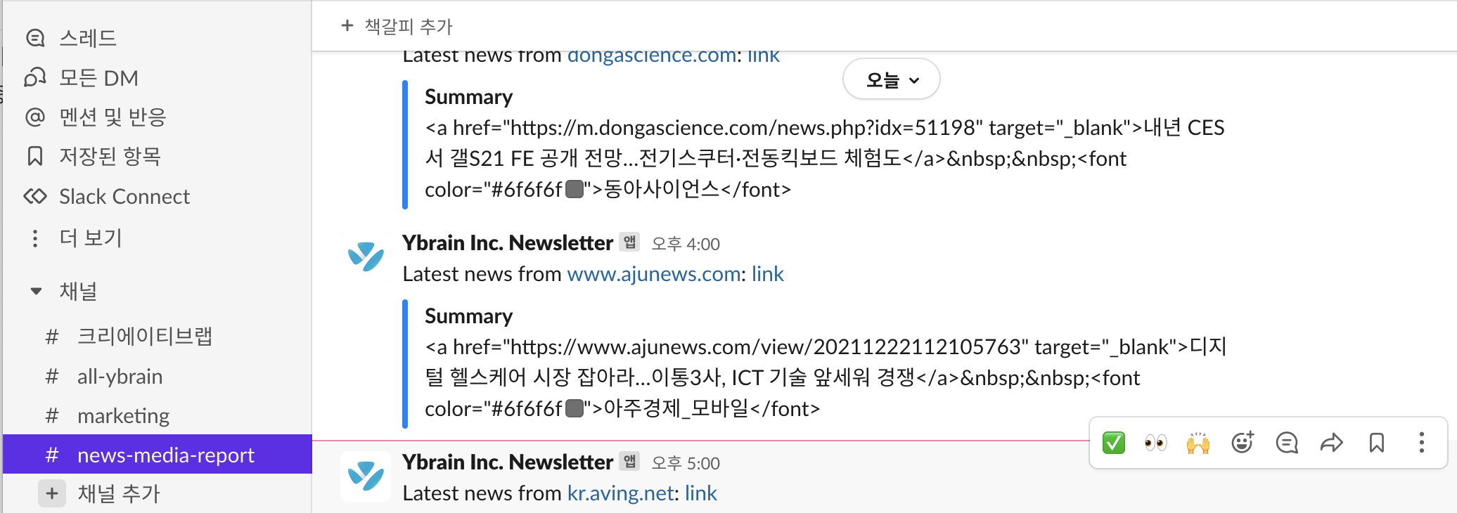 저는 지금 #크리에이티브랩, #all-ybrain, #marketing, #news-media-report 이렇게 4가지 채널에 속해 있습니다. #크리에이티브랩에는 마케팅과 디자인 그리고 기획을 담당하는 팀원들이 함께 있고, #all-ybrain에는 임직원 포함 전직원이 함께 있습니다. 말그대로 #크리에이티브랩에서는 팀 이슈사항이나 공지, 전달사항들을 이야기하고, #all-ybrain에서는 전사적인 이슈사항들을 얘기하는 것이죠.